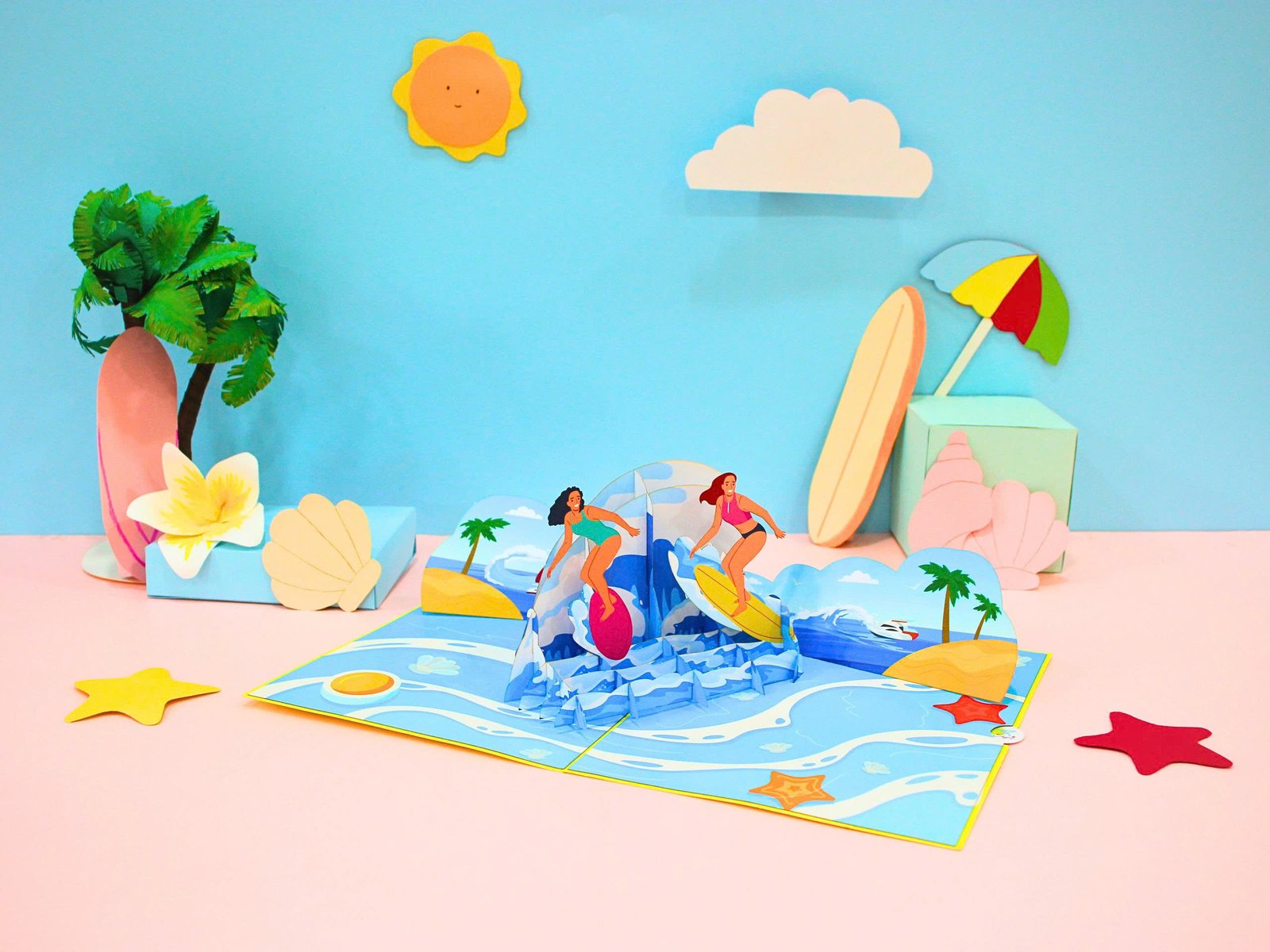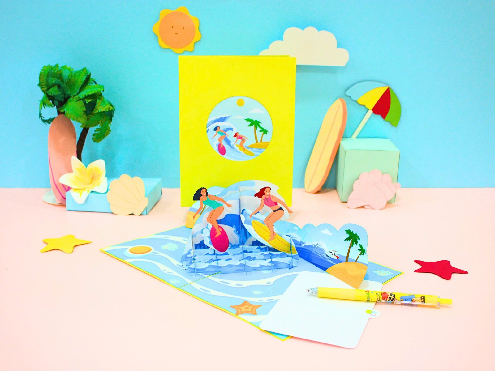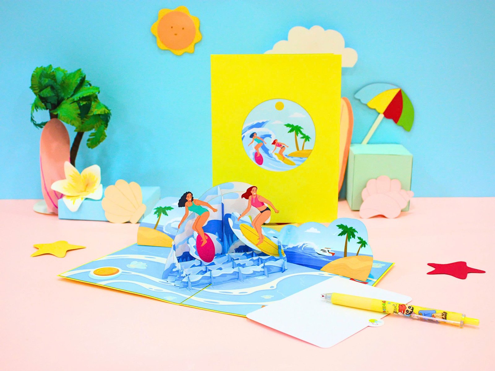 Each “Surfing On Beach 3D Pop Card” is meticulously crafted and includes one card featuring the exhilarating surfing scene, along with a coordinating envelope, a protective plastic cover, and a Blossoming Note for your personalized message.